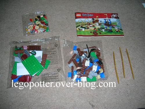 Une fois la boite ouverte, on trouve une notice (en bon état ! merci au facteur), trois petits sacs où tout est mélangé (le set est petit, ce n’est pas gênant) et trois barres droites souples. Ah, donc ils ont fait leurs anneaux de buts comme cela… cela me laisse dubitative mais pourquoi pas.